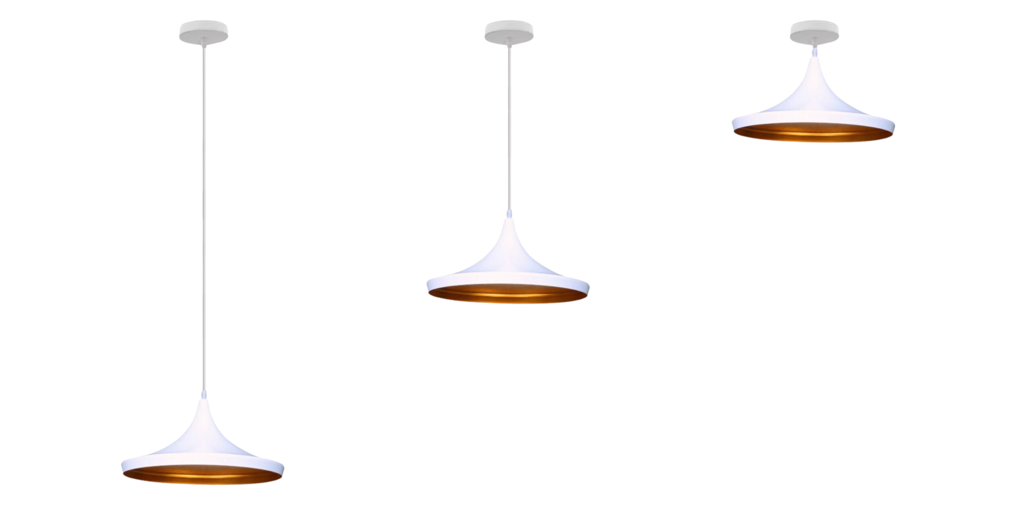 Jej smukła, elegancka linia zakończona szerokim kloszem w kolorze bieli zaskakuje złotym wnętrzem, które dodaje światłu ciepła i przytulności. Regulowana wysokość pozwala dostosować ją do każdej aranżacji – czy to nad stołem w jadalni, wyspą kuchenną, czy w salonowym kąciku.