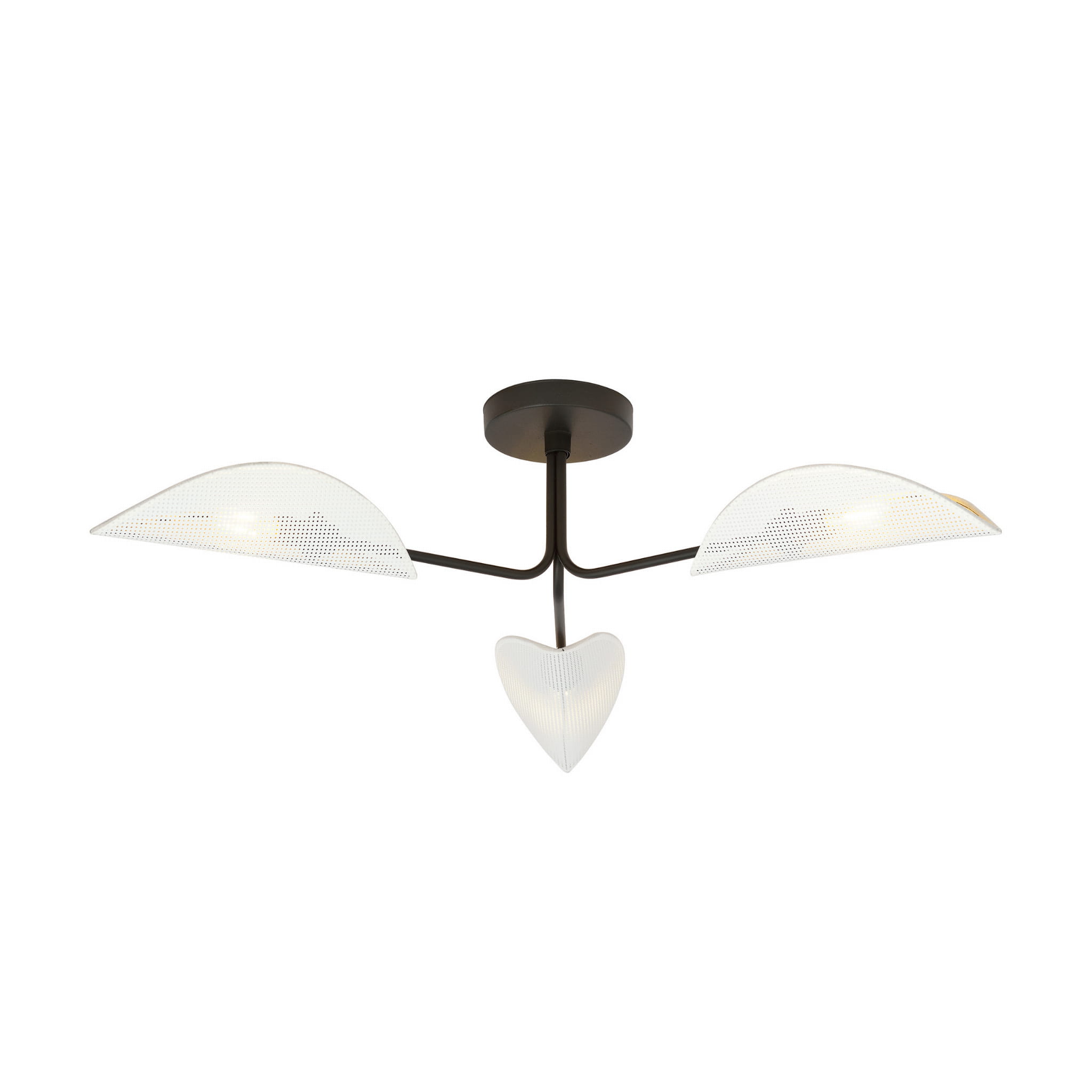 Największym atutem lampy MEAVE jest jej oryginalna forma. Trzy rozchodzące się ramiona zakończone są subtelnymi, perforowanymi kloszami, które delikatnie rozpraszają światło, tworząc przyjemny klimat. Centralny element o miękkiej, organicznej linii nadaje lampie wyjątkowego charakteru. To sprawia, że produkt doskonale sprawdza się jako designerska lampa sufitowa do salonu, jadalni lub nowoczesnej kuchni.