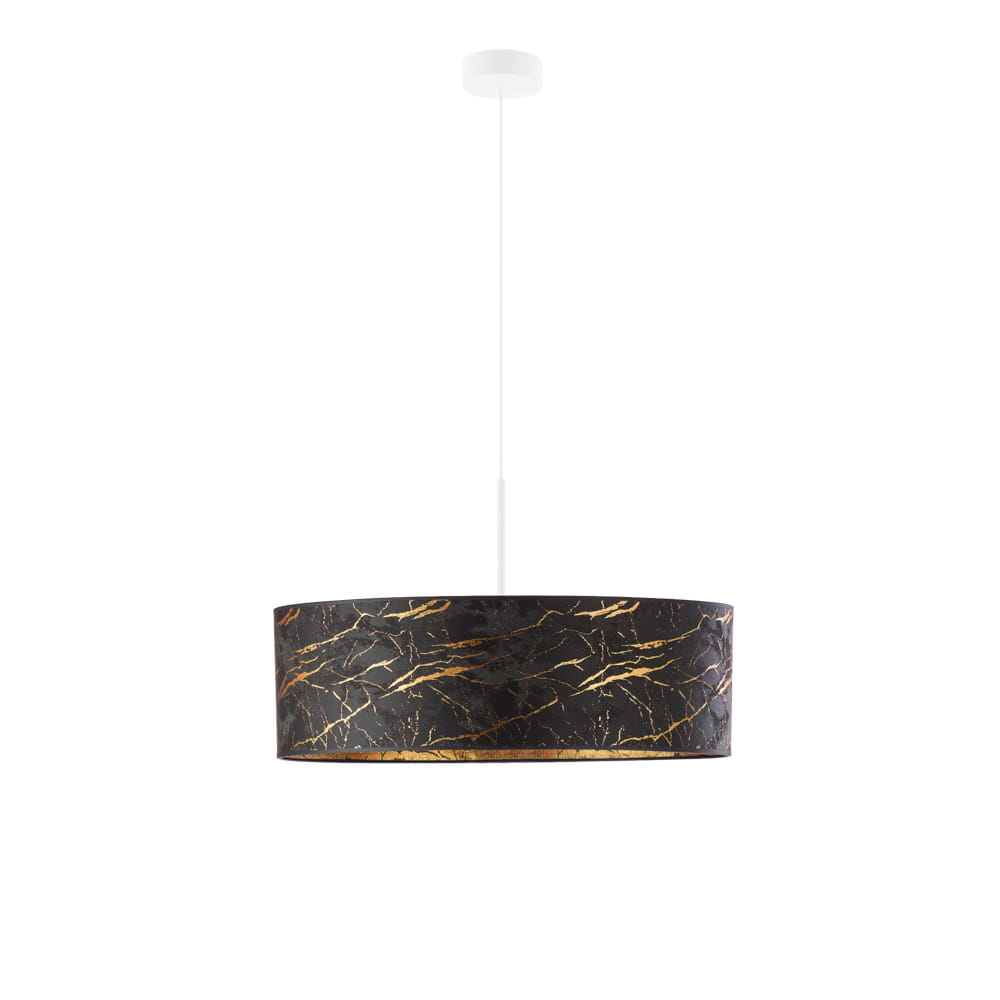 Lampa wisząca OLVIA MARBLE to niezwykle elegancki żyrandol z abażurem w kształcie walca. Jej minimalistyczna konstrukcja znajdzie swoje miejsce we wnętrzach urządzonych w stylu nowoczesnym i klasycznym. Dzięki lampie OLVIA uzyskasz w swoim mieszkaniu niepowtarzalny klimat, a przy odpowiednim doborze kolorystyki wnętrze zyska unikatowego charakteru. Klosz lampy wykonany został z tkaniny imitującej marmur, a złote przeszycia dodają efektu WOW. Zdecydowanym atutem lampy jest regulowany przewód, którego długość osiąga 120 cm.