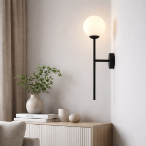 Kinkiet KENDALL to designerska lampa ścienna, która łączy minimalistyczną formę, nowoczesny styl i ponadczasową elegancję. Ten czarny kinkiet ścienny z kulą doskonale wpisuje się w aktualne trendy wnętrzarskie, takie jak styl loft, styl industrialny, nowoczesny minimalizm czy eleganckie wnętrza modern classic. Prosta, geometryczna konstrukcja oraz mlecznobiały, kulisty klosz sprawiają, że lampa jest zarówno funkcjonalnym źródłem światła, jak i wyrazistą dekoracją ściany.