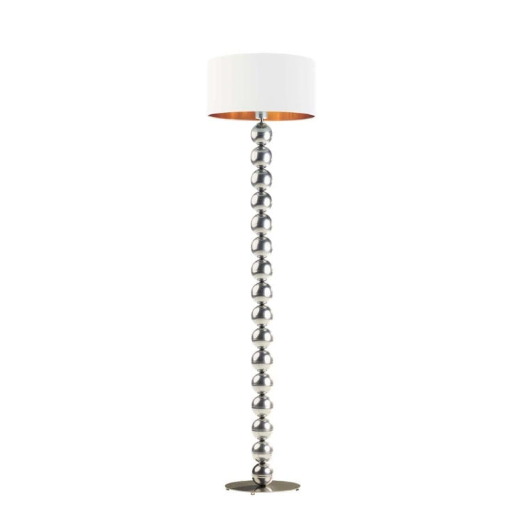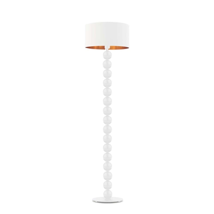 Lampa podłogowa SAMANTA GOLD łączy w sobie estetykę i funkcjonalność. Solidna, ozdobna podstawa z kulistych elementów nadaje jej niepowtarzalny wygląd, a szeroki, cylindryczny abażur z delikatnym złotym wykończeniem wewnątrz podkreśla elegancję całej konstrukcji. Ciepłe światło odbijające się od złotego wnętrza tworzy subtelne refleksy, które pięknie rozświetlają przestrzeń i nadają jej wyjątkowego klimatu.