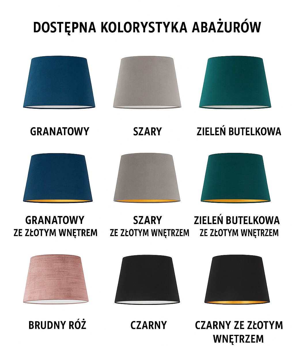 Certyfikaty: zgodność CE, niepalność tkaniny abażurowej