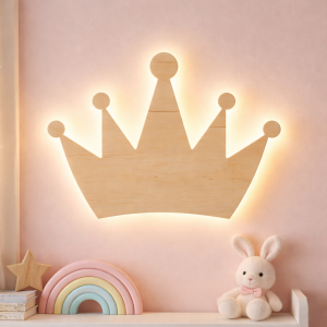 Ten uroczy kinkiet w kształcie korony to coś więcej niż lampka – to mały element bajkowego świata w dziecięcym pokoju. Wykonany z naturalnego drewna, zachwyca prostą formą i ciepłym, przytulnym charakterem. Subtelne podświetlenie rozchodzi się miękką poświatą wokół kształtu korony, tworząc spokojną atmosferę idealną do wyciszenia przed snem.