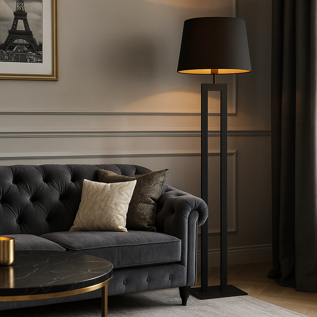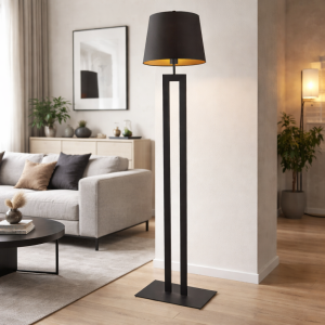 Dzięki uniwersalnemu kolorowi i ponadczasowej formie, czarna lampa podłogowa ze złotym wnętrzem abażura dopasuje się do większości aranżacji – od surowych loftów, przez wnętrza w stylu skandynawskim, aż po nowoczesne apartamenty i przestrzenie glamour.