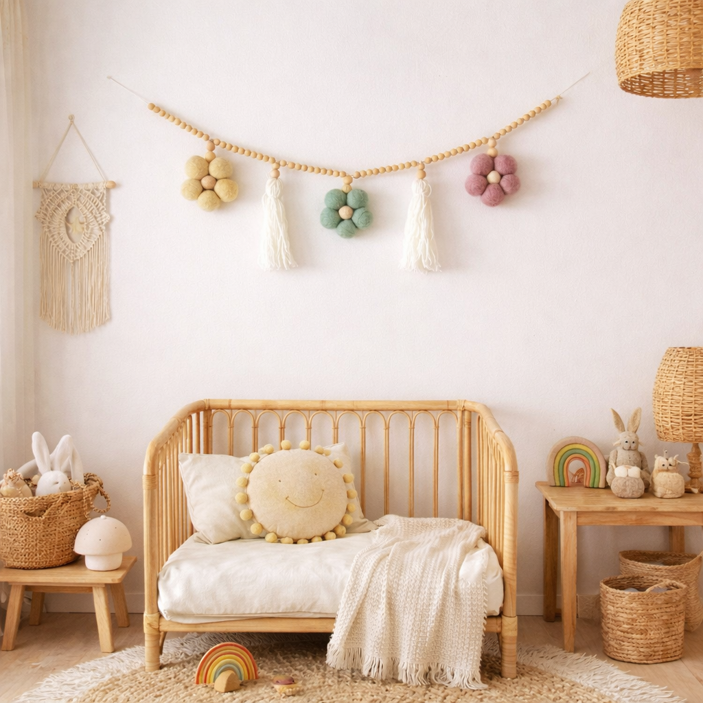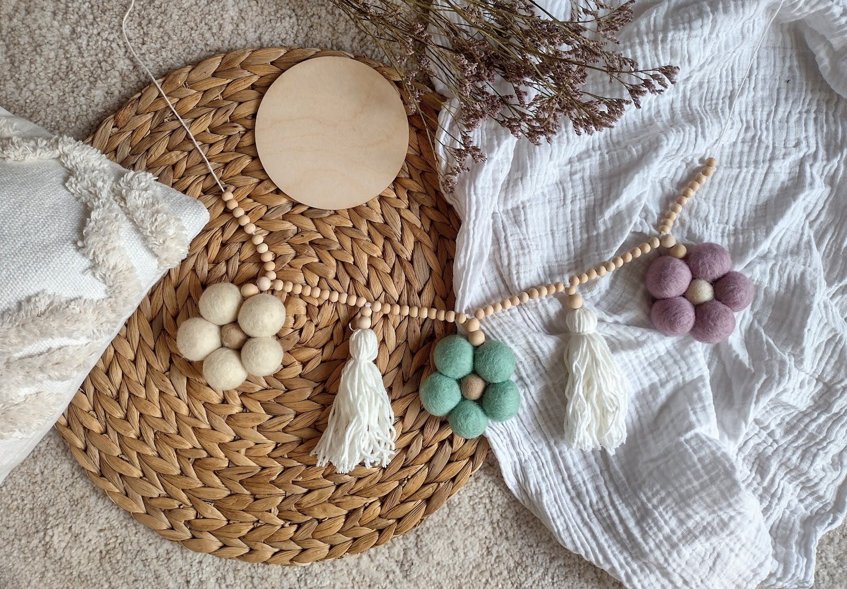Boho Girlanda Handmade z Filcowymi Kwiatami – subtelna ozdoba do pokoju dziecka