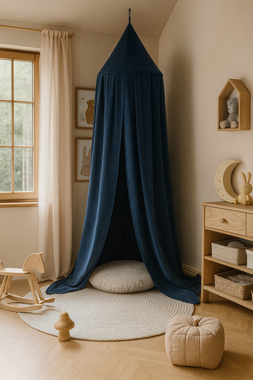 Funkcjonalność – sprawdzi się jako baldachim do łóżeczka, nad matą edukacyjną czy w kąciku do czytania. To idealne miejsce do odpoczynku, zabawy i wyciszenia.