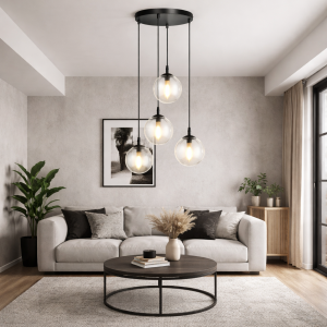Dzięki zastosowaniu transparentnych kloszy ze szkła, lampa doskonale eksponuje dekoracyjne żarówki typu Edison, tworząc przytulny klimat i efektowne rozproszenie światła. Szklane kule dodają lekkości całej konstrukcji, a czarne metalowe elementy podkreślają jej nowoczesny i industrialny charakter. To idealna lampa do salonu, jadalni, kuchni, nad stolik kawowy lub nad stół, a także do przestrzeni komercyjnych, takich jak restauracje czy biura.