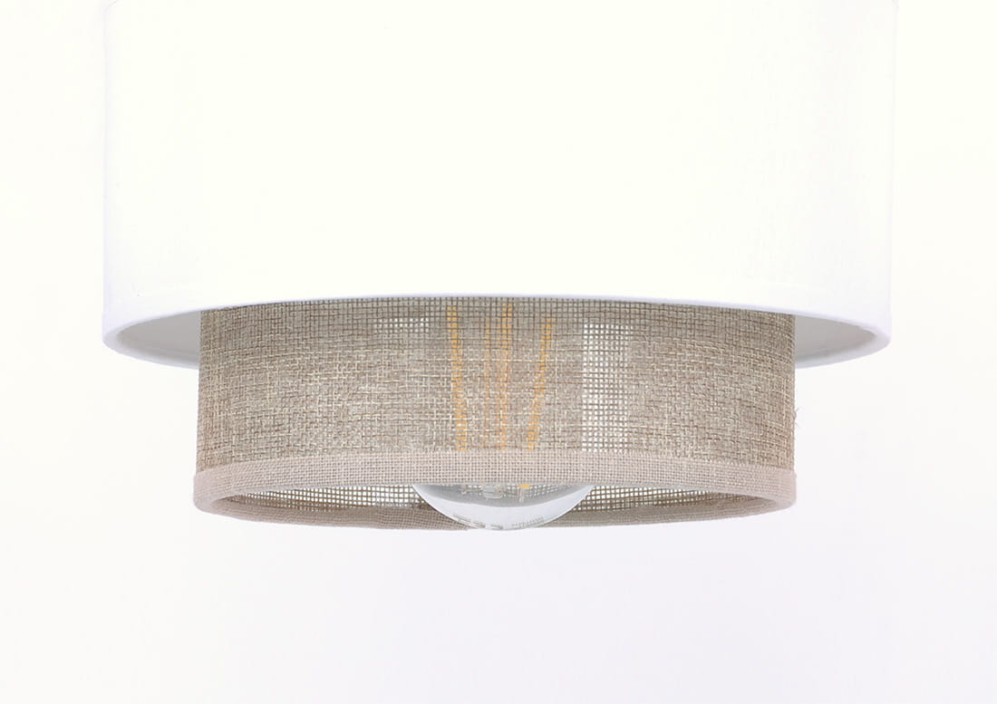 Największą ozdobą lampy jest dwuwarstwowy abażur, który zapewnia miękkie, rozproszone światło. Zewnętrzna, jasna tkanina sprawia, że kinkiet daje przyjemne, nastrojowe oświetlenie, idealne do budowania klimatu we wnętrzu. Wewnętrzna warstwa w odcieniu naturalnego lnu dodaje lampie głębi i podkreśla jej dekoracyjny charakter. Taki tekstylny abażur do kinkietu nie tylko wygląda elegancko, ale też skutecznie łagodzi światło, tworząc ciepłe światło w pomieszczeniu i sprzyjającą relaksowi atmosferę.