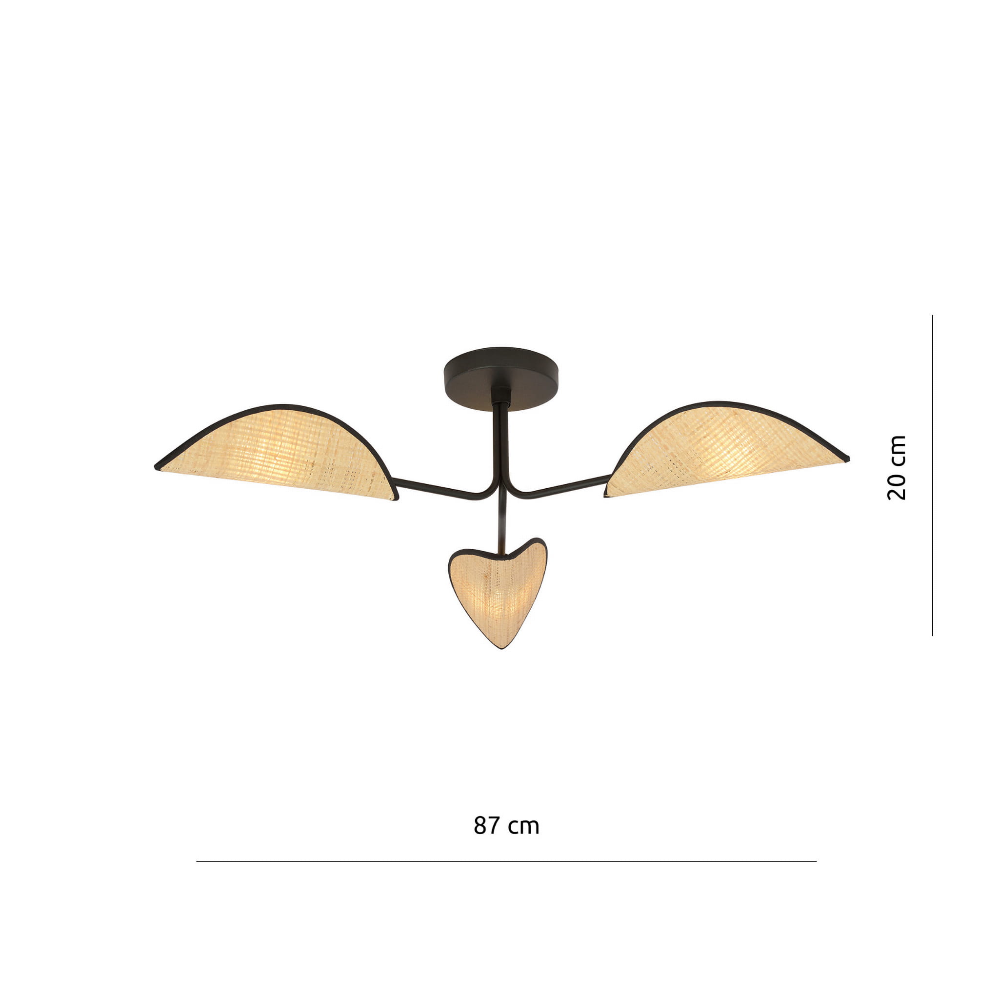 Lampa sufitowa MEAVE to wyjątkowe połączenie lekkości natury i współczesnego designu. Jej organiczna forma, inspirowana kształtem liści, przyciąga wzrok i nadaje wnętrzu subtelny, artystyczny charakter. Trzy klosze wykonane z plecionego rattanu delikatnie rozpraszają światło, tworząc ciepłą i przytulną atmosferę – idealną do jadalni, salonu czy sypialni.