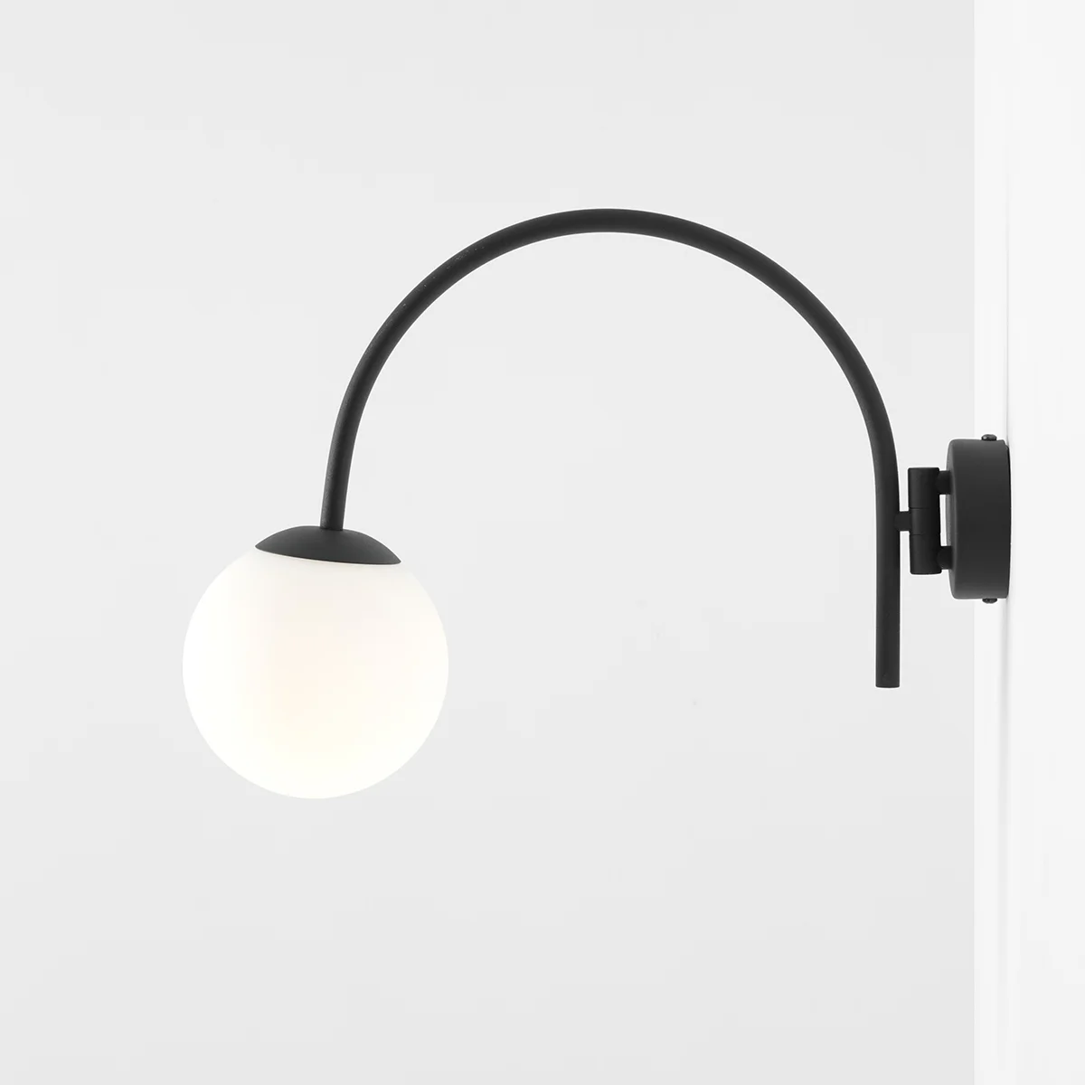 Łukowy kinkiet do czytania w sypialni HAZEL z mlecznobiałą kulą ze szkła i czarnym stelażem
