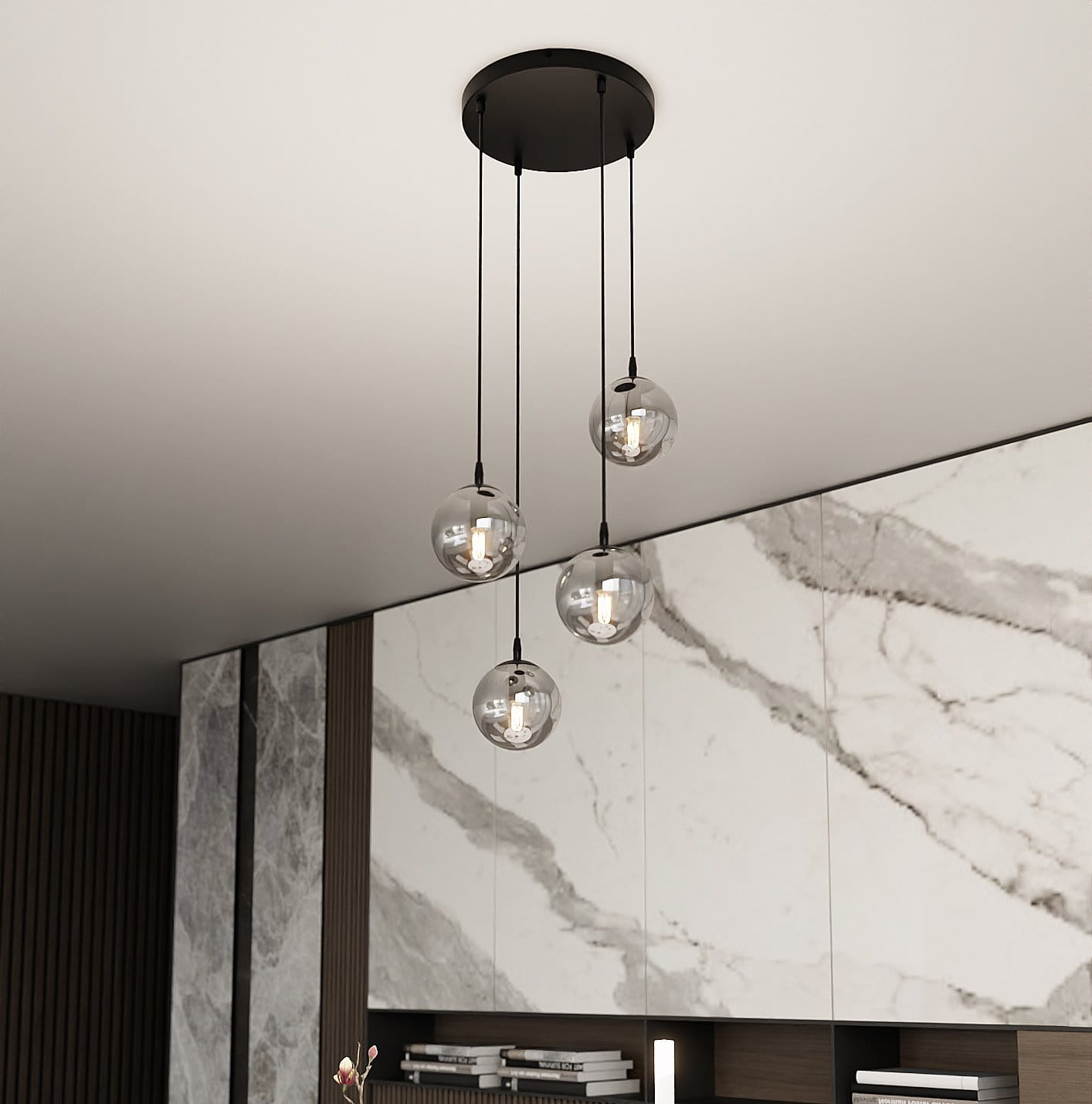Lampa wisząca OPALINA 4 to wyjątkowe połączenie nowoczesnego designu i subtelnej elegancji. Cztery kuliste, szklane klosze w dymionym wykończeniu pięknie rozpraszają światło, tworząc przytulną i nastrojową atmosferę w każdym wnętrzu. Asymetryczne zawieszenie punktów świetlnych dodaje lekkości i dynamiki, a czarna, minimalistyczna konstrukcja doskonale wpisuje się w stylistykę loftową oraz nowoczesną.