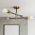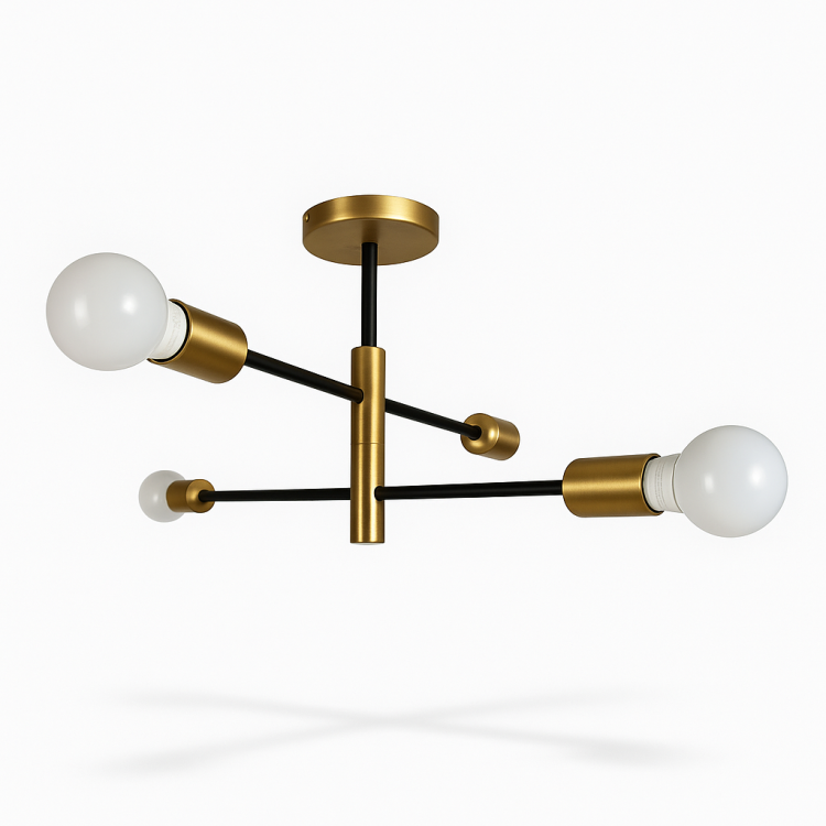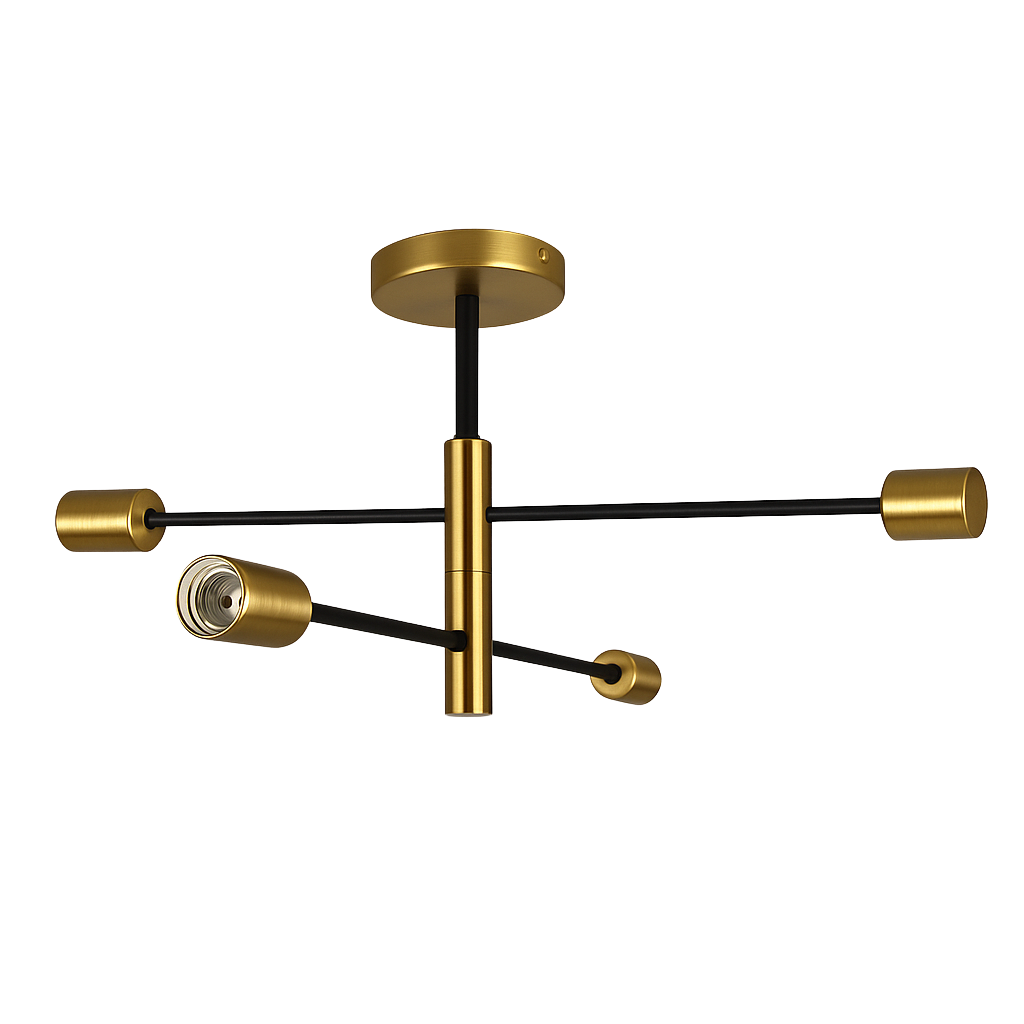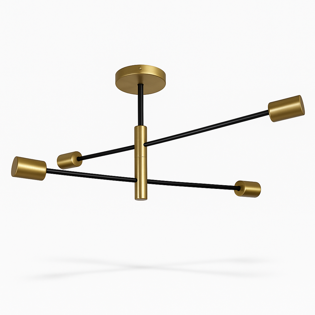 Cztery źródła światła rozmieszczone na metalowych ramionach w kolorze czarnym zakończonych złotymi oprawami zapewniają równomierne oświetlenie całego pomieszczenia. Prosta, geometryczna konstrukcja dodaje wnętrzu charakteru, a złote detale wprowadzają nutę luksusu.