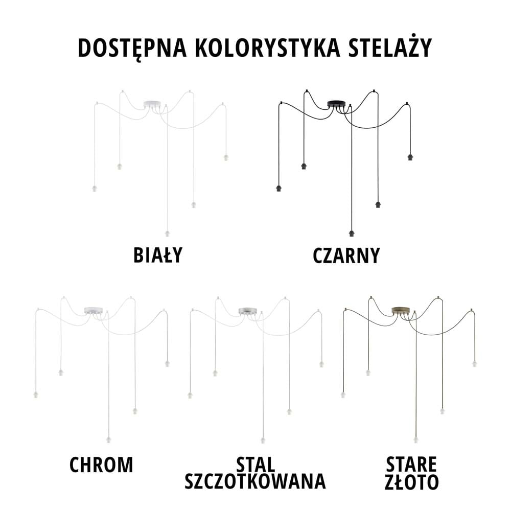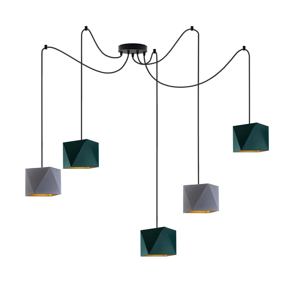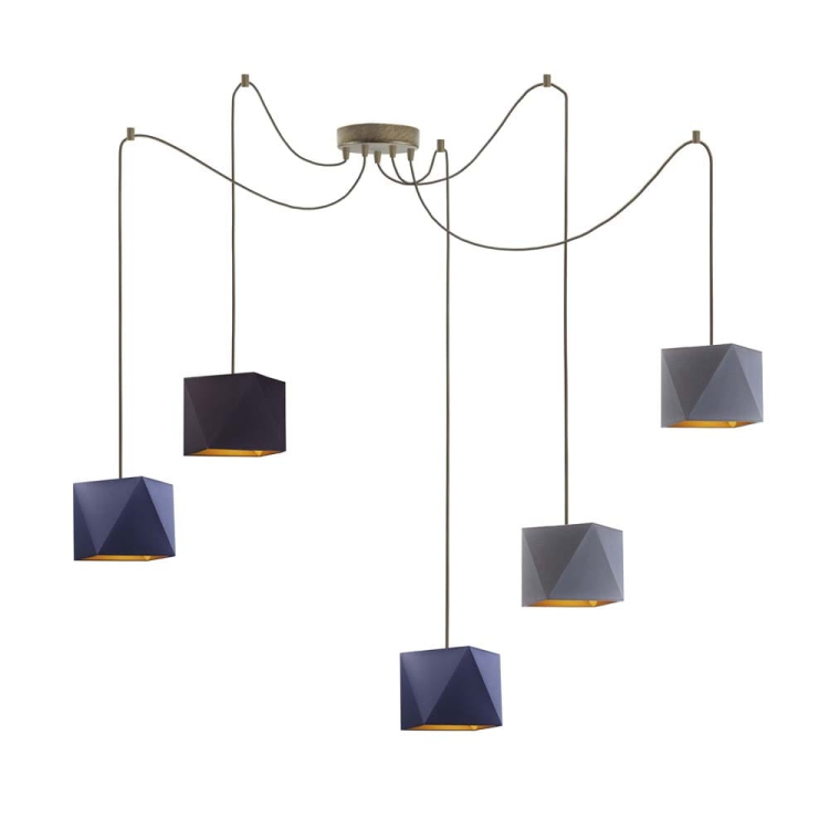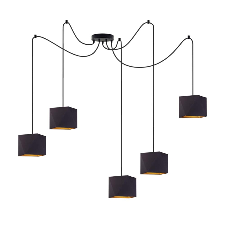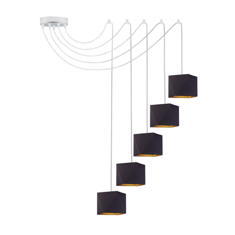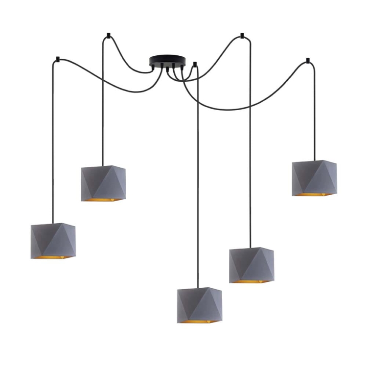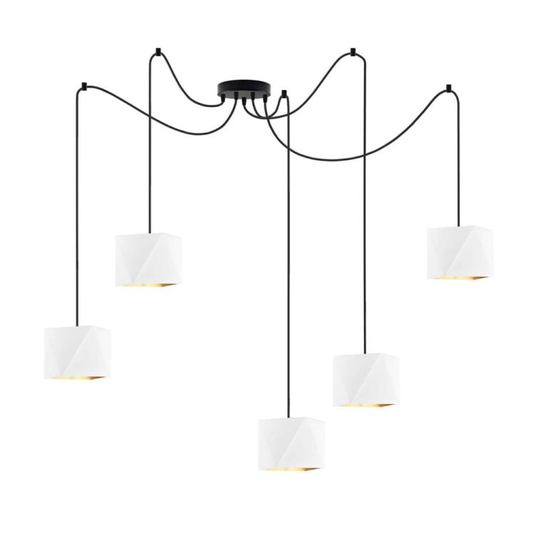 Lampa wisząca DOLORES GOLD to efektowna, rozłożysta kompozycja złożona z pięciu ramion, tworzących lekką kompozycję w jednym lub w wielu wariantach kolorystycznych. Model wyraźnie zrywa z tradycyjną formą bogato zdobionych żyrandoli, zwracając się ku prostej, użytkowej formie. Źródła światła zamontowano na długich przewodach, które w kilku miejscach przytwierdza się do sufitu, a ramiona pająka rozciąga według własnego pomysłu i podwiesza. Lampa najlepiej będzie się prezentować zawieszona w wysokich pomieszczeniach, nad stołem czy w głównej części salonu. Niezależnie jednak od wyboru wnętrza, w którym zawiśnie, wszędzie wprowadzi niepowtarzalny klimat również dzięki światłu, które pięknie rozleje się ciepłą barwą. Stonowana kolorystyka: bieli, szarości i czerni wpasuje ten żyrandol do różnorodnych wnętrz architektonicznych a nietuzinkowy kształt nada pomieszczeniu charakteru. Lampa - pająk to funkcjonalna dekoracja, hit aranżacyjny ostatnich lat!