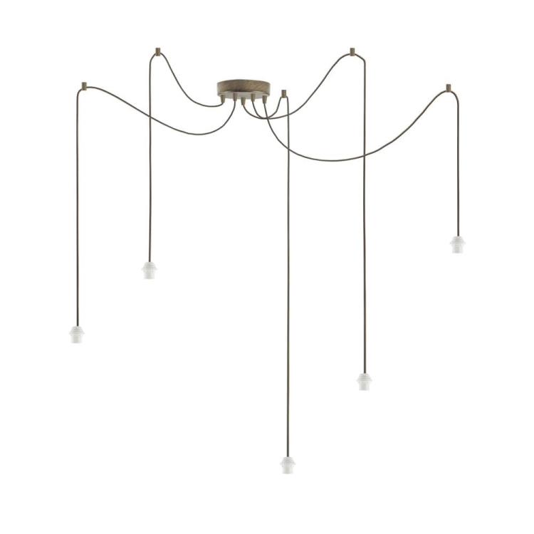 Lampa wisząca DOLORES GOLD to efektowna, rozłożysta kompozycja złożona z pięciu ramion, tworzących lekką kompozycję w jednym lub w wielu wariantach kolorystycznych. Model wyraźnie zrywa z tradycyjną formą bogato zdobionych żyrandoli, zwracając się ku prostej, użytkowej formie. Źródła światła zamontowano na długich przewodach, które w kilku miejscach przytwierdza się do sufitu, a ramiona pająka rozciąga według własnego pomysłu i podwiesza.