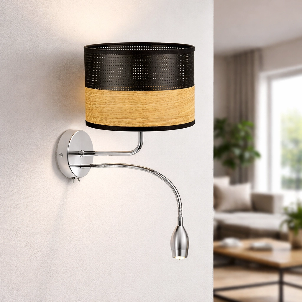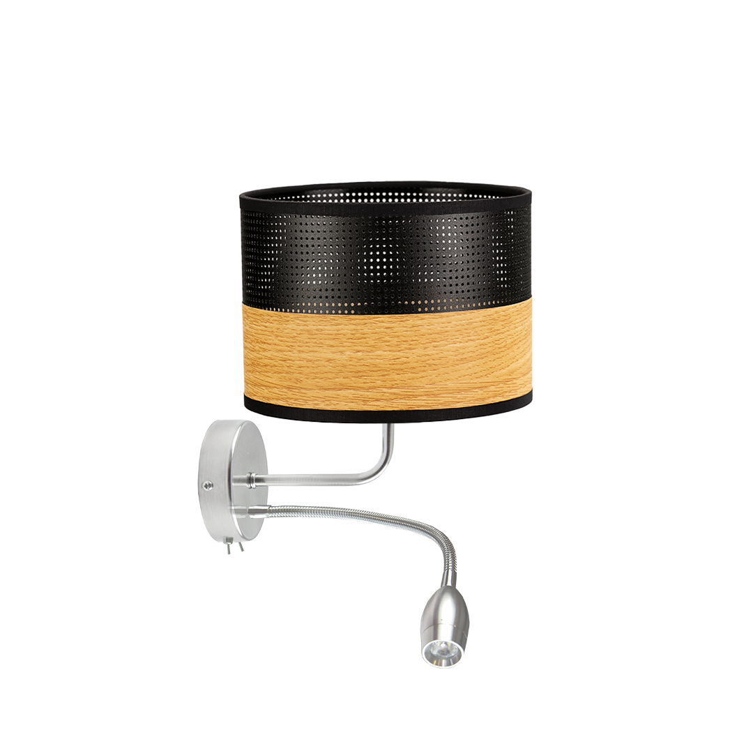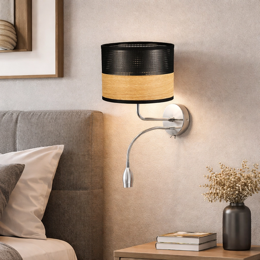 Ten nowoczesny kinkiet ścienny to połączenie wyrazistego stylu i codziennej wygody. Designerski abażur łączy perforowany metal w czarnym kolorze z ciepłym dekorem drewna, tworząc efektowny kontrast idealny do wnętrz w stylu loft, nowoczesnym i industrialnym. Otwarta struktura klosza subtelnie rozprasza światło, budując przytulny klimat w sypialni.