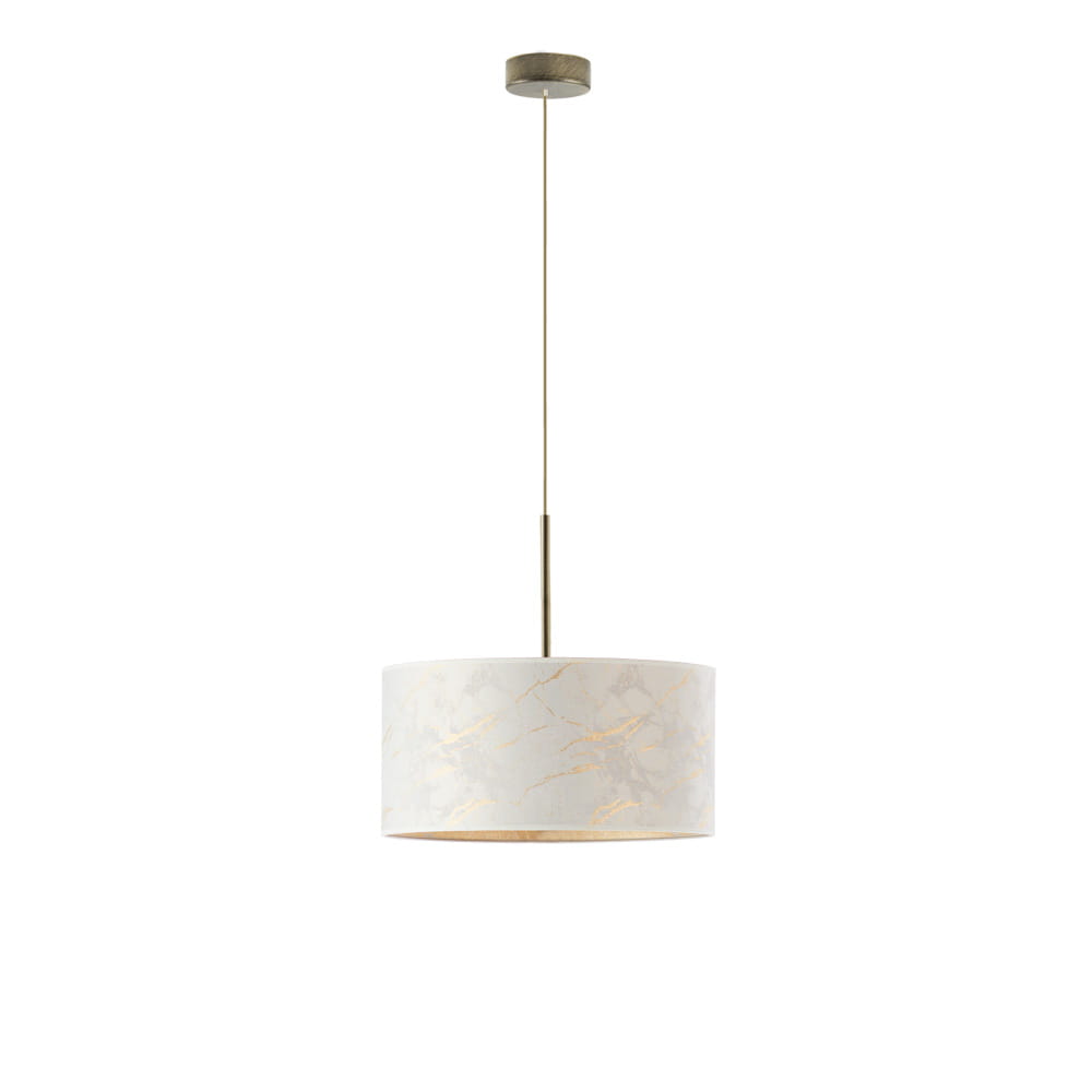 Lampa wisząca OLVIA MARBLE to niezwykle elegancki żyrandol z abażurem w kształcie walca. Jej minimalistyczna konstrukcja znajdzie swoje miejsce we wnętrzach urządzonych w stylu nowoczesnym i klasycznym. Dzięki lampie OLVIA uzyskasz w swoim mieszkaniu niepowtarzalny klimat, a przy odpowiednim doborze kolorystyki wnętrze zyska unikatowego charakteru. Klosz lampy wykonany został z tkaniny imitującej marmur, a złote przeszycia dodają efektu WOW. Zdecydowanym atutem lampy jest regulowany przewód, którego długość osiąga 120 cm.