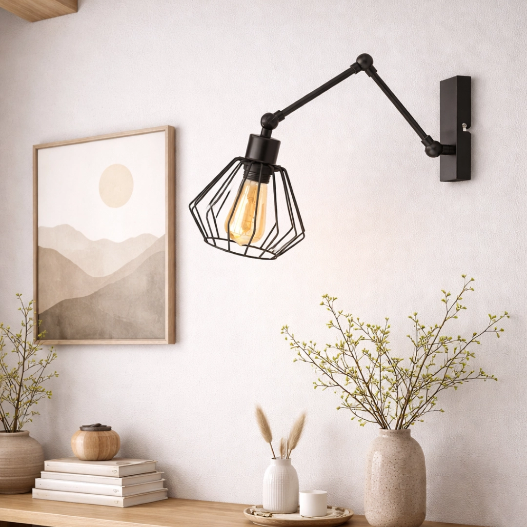 Lampa ścienna HELEN LOFT to wyjątkowy kinkiet w stylu industrialnym, który łączy minimalistyczny design z wysoką funkcjonalnością. Dzięki regulowanemu ramieniu z przegubami lampa pozwala precyzyjnie skierować światło tam, gdzie jest najbardziej potrzebne. To doskonałe rozwiązanie do salonu, sypialni, biura, korytarza czy przestrzeni w stylu loftowym. Metalowa konstrukcja w czarnym kolorze oraz dekoracyjny klosz z drucianej siatki nadają lampie surowy, a jednocześnie elegancki charakter.