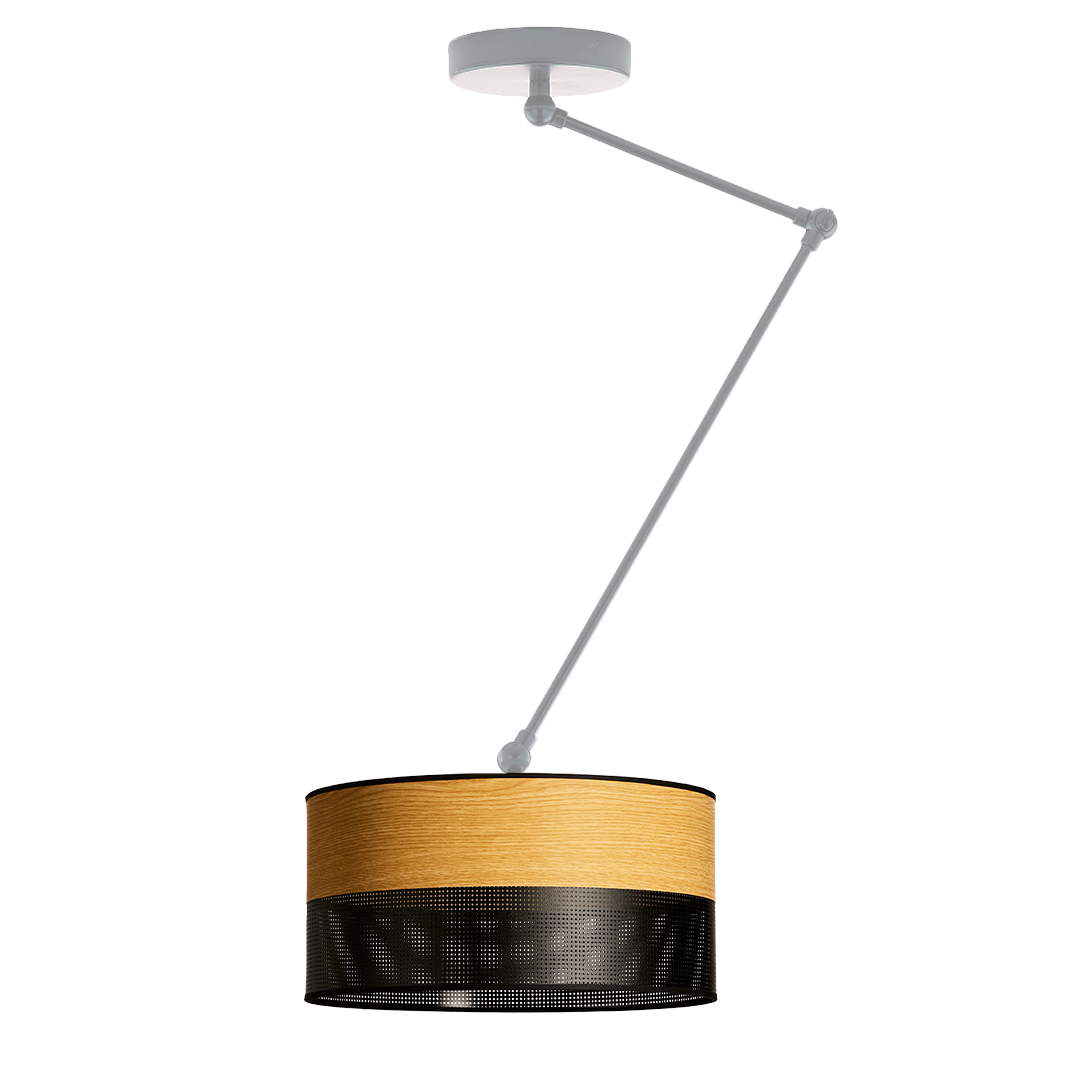 Lampa NOWA FORNIŻUR to wyjątkowe połączenie nowoczesnego designu i naturalnej estetyki, stworzone z myślą o stylowych, współczesnych wnętrzach. Jej unikalny abażur wykonany został z trwałego materiału PVC imitującego fornir, który wiernie oddaje ciepło i strukturę drewna, nadając przestrzeni przytulny, elegancki klimat. Dolna część w formie czarnego ażuru subtelnie rozprasza światło, tworząc nastrojowe efekty i dodając wnętrzu głębi.