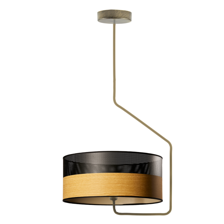 Lampa wisząca ABIGAIL FORNIŻUR to wyjątkowe połączenie nowoczesnej formy i naturalnej inspiracji. Jej charakterystyczny abażur wykonano z tkaniny imitującej fornir, zestawionej z eleganckim, czarnym ażurem, co tworzy efekt subtelnej gry światła i cienia. Dzięki temu wnętrze zyskuje przytulny, a zarazem wyrafinowany klimat.