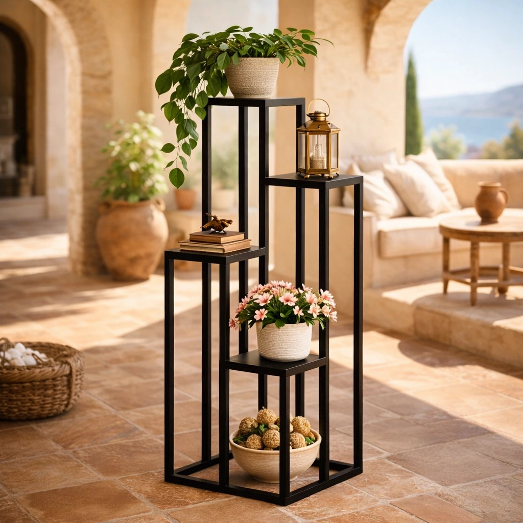- Funkcjonalność: Cztery półeczki zapewniają wygodne i efektowne eksponowanie roślin na różnych poziomach.
