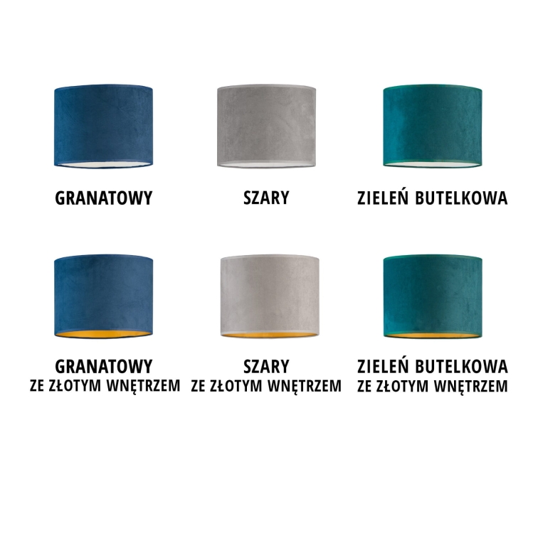 Lampa ANN VELUR dostępna jest w kilku wariantach kolorystycznych abażura, co pozwala dopasować ją do różnych stylów wnętrzarskich. W zależności od preferencji można wybrać także wersję z białym lub złotym wnętrzem abażura. Białe wnętrze zapewnia bardziej neutralne, jasne światło, natomiast złote wnętrze nadaje oświetleniu cieplejszy, bardziej nastrojowy charakter i dodatkowo podkreśla elegancję lampy.