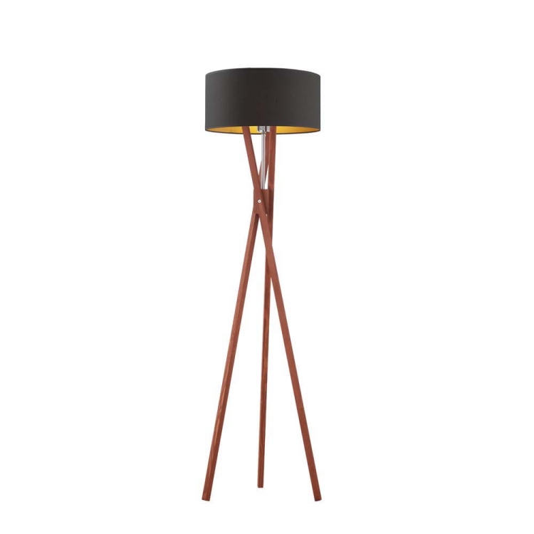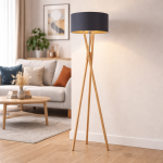 Lampa podłogowa Ivonne Gold to wyjątkowe połączenie naturalnego drewna i subtelnego blasku złota, które wnosi do wnętrza harmonię i ponadczasowy styl. Trójnożna konstrukcja inspirowana skandynawskim designem nadaje jej lekkości, a jednocześnie zapewnia stabilność i trwałość na lata. Czarny abażur ze złotym wnętrzem nie tylko przyciąga wzrok, ale również pięknie rozprasza światło, tworząc ciepłą, przytulną atmosferę.