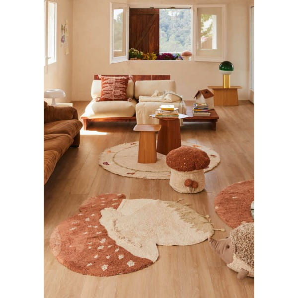 Motyw grzybków sprawia, że dywan doskonale komponuje się z meblami i dekoracjami w stylu leśnym, takimi jak tapety z motywami drzew, pluszowe zwierzątka, drewniane dodatki czy ekologiczne akcesoria. Stanowi piękny element aranżacji i nadaje wnętrzu przytulnego, bajkowego klimatu. To również świetny pomysł na prezent dla dziecka – praktyczny, estetyczny i ponadczasowy.