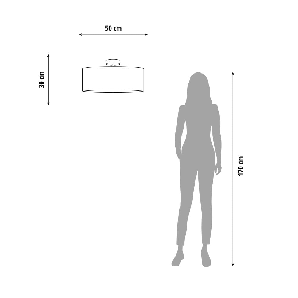 Dzięki różnym średnicom (od 30 do 60 cm) bez trudu dopasujesz ją do każdego wnętrza – od małego salonu, przez sypialnię, po przestronny hol. Prosty, cylindryczny kształt abażura w połączeniu z matową, czarną podstawą sufitową podkreśla ponadczasowy charakter lampy.