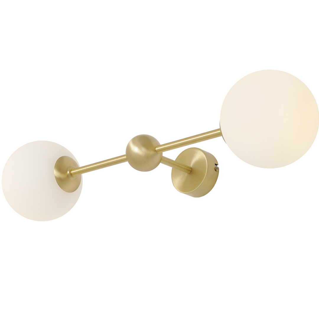 CECILY to stylowy kinkiet ścienny, który łączy nowoczesną formę z ponadczasową elegancją. Dwa mleczne, szklane klosze w kształcie kul subtelnie rozpraszają światło, tworząc przyjemną, nastrojową atmosferę w pomieszczeniu. Złote, satynowe wykończenie metalowych elementów dodaje całości szlachetności i sprawia, że lampa staje się nie tylko źródłem światła, ale też wyrafinowaną dekoracją ściany.